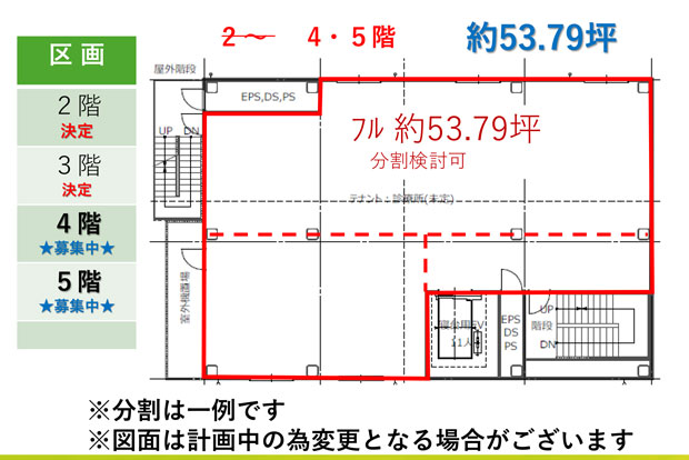 | 4階 | 53.79坪(分割可) | 16,500円/坪(税込) | 賃料に含む | 月額賃料の6ヶ月分 | 定期借家:20年 | |