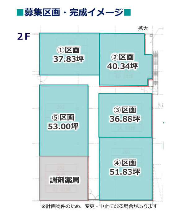 | ②区画 | 40.34坪 | 応相談 | 賃料の10ヶ月分 | あり | 10年(相談可) | |