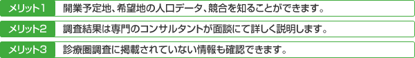 診療圏調査の資料提供及び、それに付随する有用な情報のご提供。 |